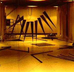 This dramatization of Edwin Abbott’s Victorian geometry text uses geometric shapes that slide along the floor in this imagined country of two dimensions, until the square meets a sphere and becomes acquainted with the third dimension. When he returns to his flat countrymen to tell them of his discovery, he is imprisoned for subversion and heresy; although previous conversations make it apparent that, like the flatlanders, the sphere cannot believe in dimensions other than his own. -- The women in Flatland and in this piece are dangerous, pointed lines, the soldiers are isosceles, impure triangles, and the highest members of this two dimensional hierarchy are such intense hexadecagons that they become circles.